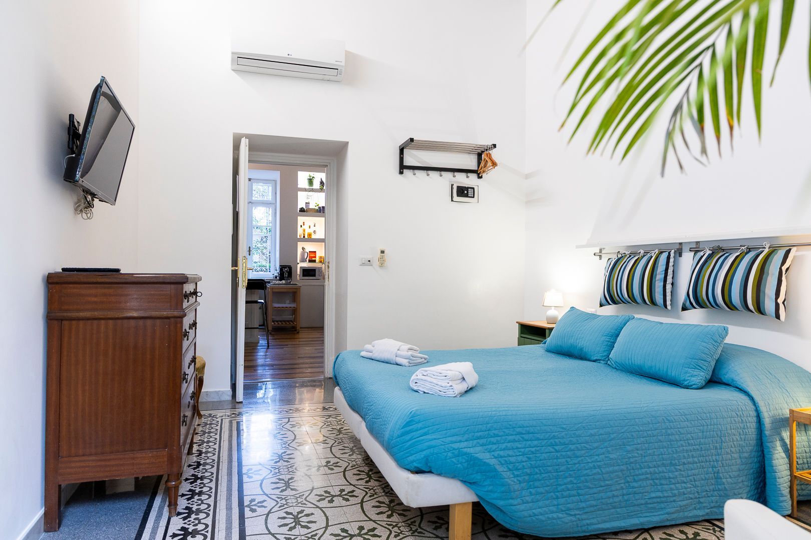 La camera verde è versatile e si adatta perfettamente anche ad una coppia di amici in vacanza o a soggiorni di lavoro. E' dotata infatti di letto matrimoniale scomponibile in due letti singoli e di un angolo lettura con comode poltroncine. E' illuminata da un’ampia finestra ed è dotata di bagno privato, di un frigo bar, di una cassetta di sicurezza ed di un televisore. La camera è climatizzata sia per l'estate che per l'inverno. Il servizio di cambio della biancheria e di pulizia è giornaliero. Questa camera può essere prenotata anche ad uso singola.